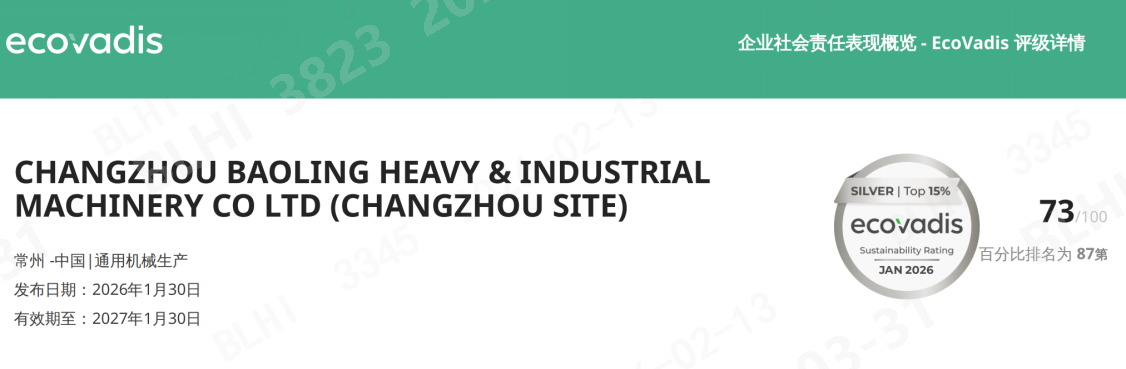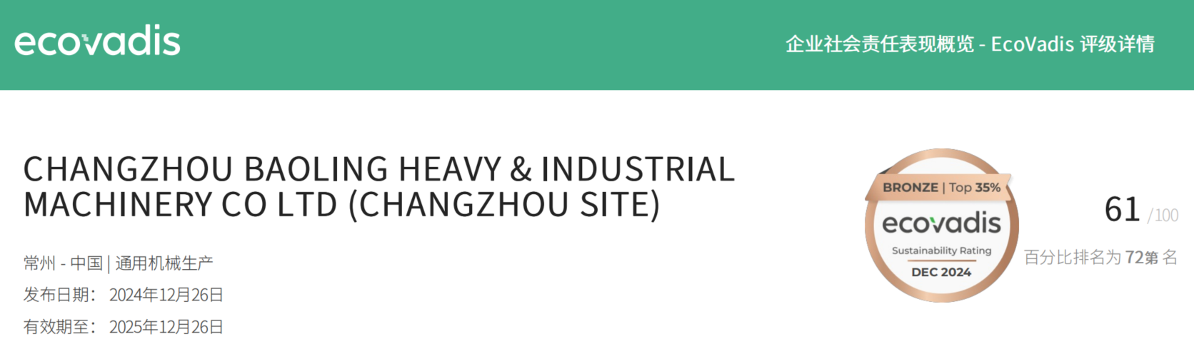 2025年,寶菱重工在企業社會責任評估中再上新臺階,以73分的優異成績榮獲EcoVadis“銀牌”認證,成功躋身所有參評公司的前15%。這是繼2024年底獲得銅